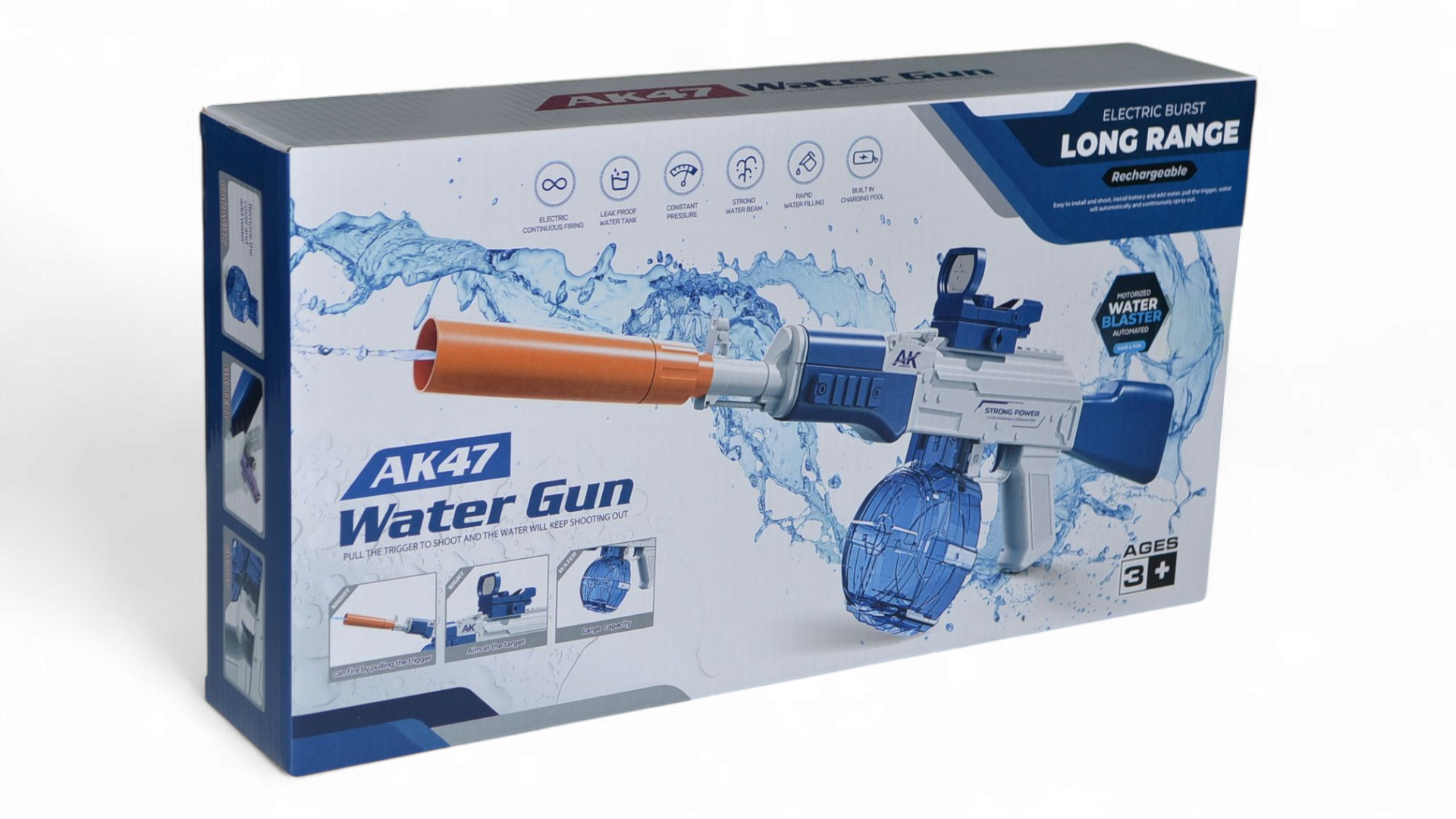Автомат изготовлен из прочного и безопасного пластика, а также включает в себя электронные компоненты для автоматической подачи воды. Благодаря этому, для стрельбы не требуется ручная подкачка – достаточно просто нажать на курок.