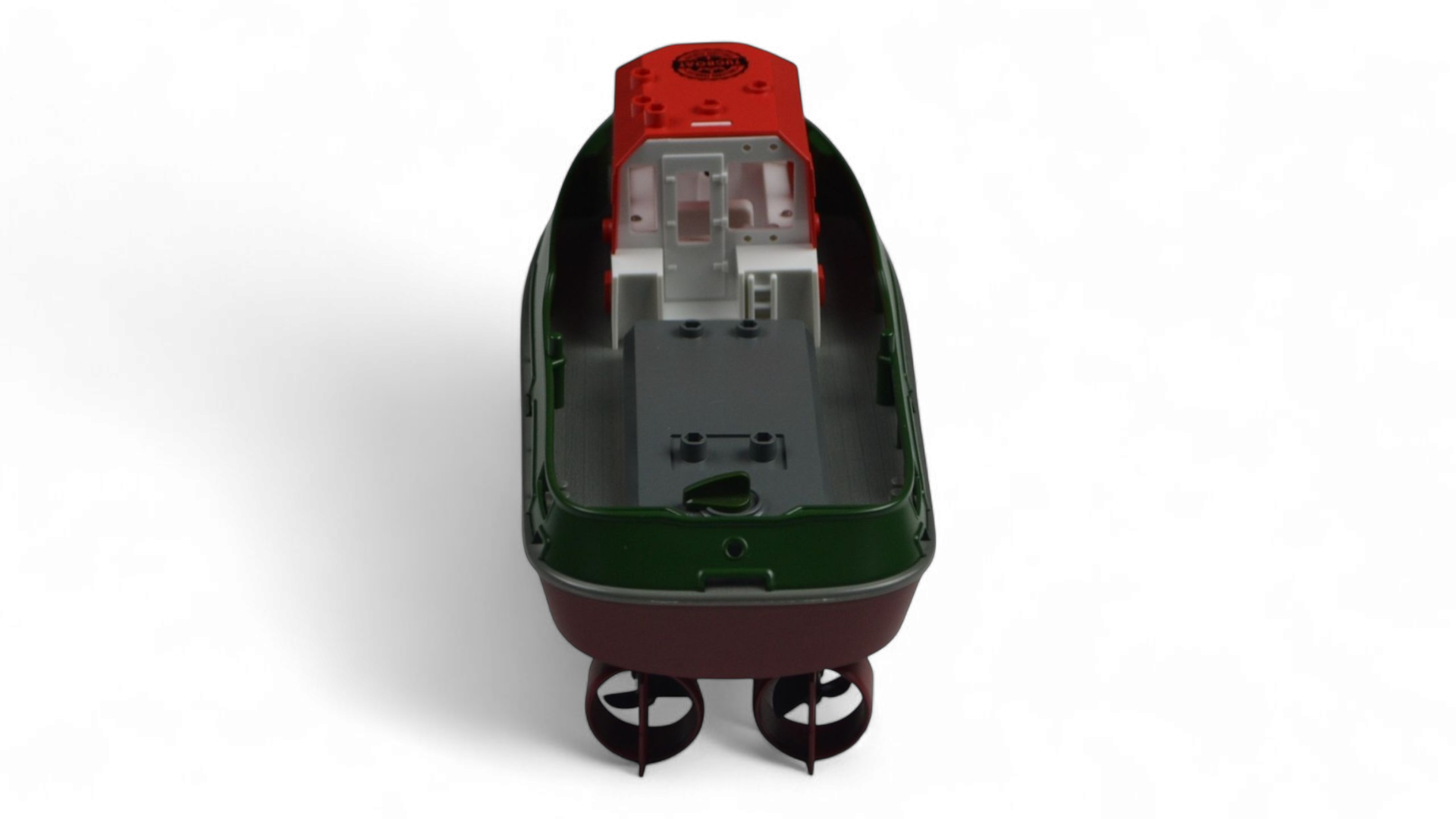 Дизайн корпуса буксира доступен в зеленой или черной отделке и включает в себя водонепроницаемую и герметичную центральную часть для электроники и батарею 3,7V, 600 mAh, которая обеспечивает до 15 минут непрерывного воспроизведения. Радиосистема 2,4 ГГц обеспечивает управление без помех на расстоянии до 50 метров. При длине 23 см, он имеет карманный размер, что упрощает его переноску и использование.