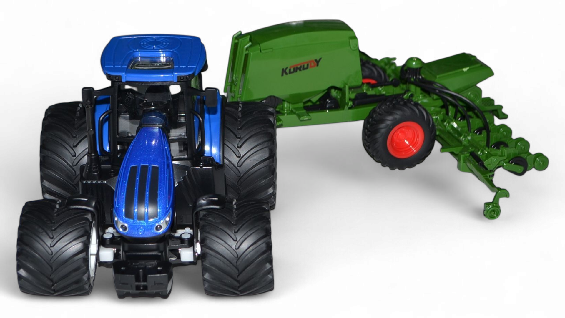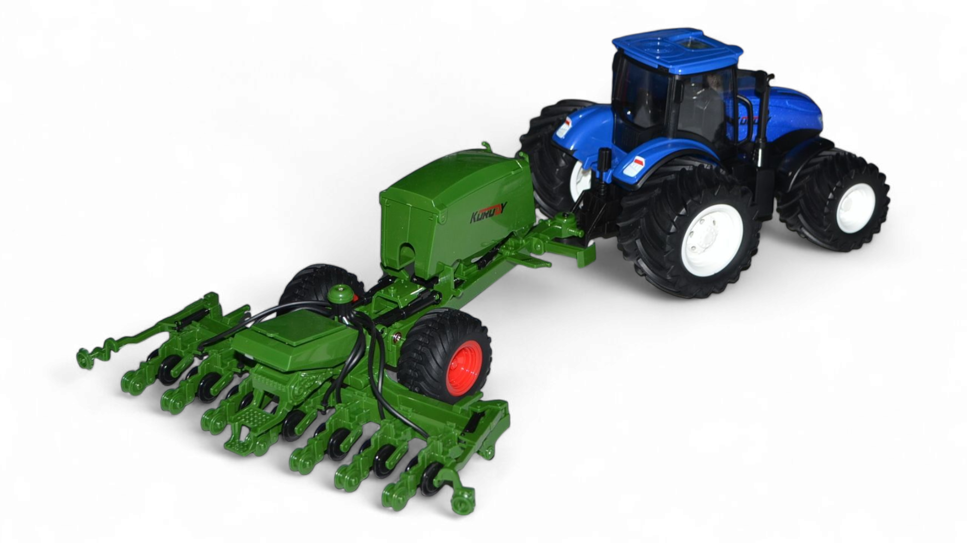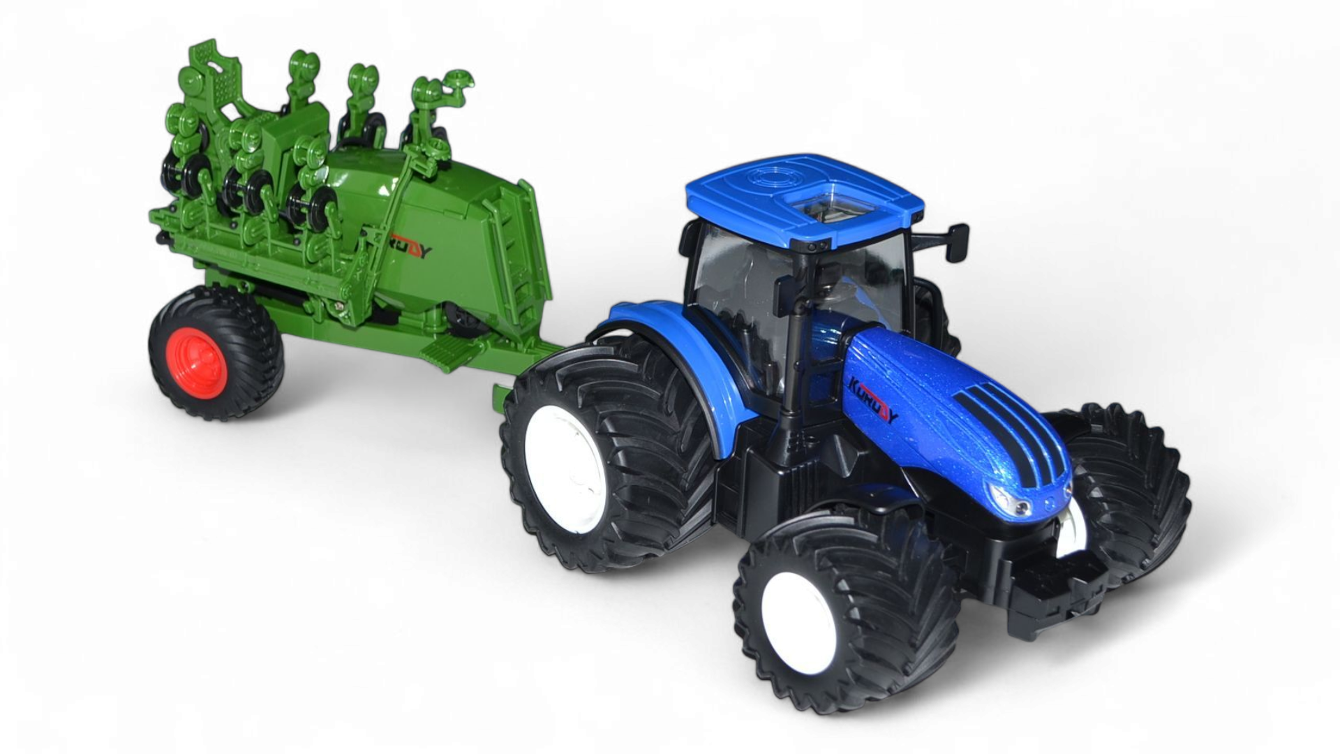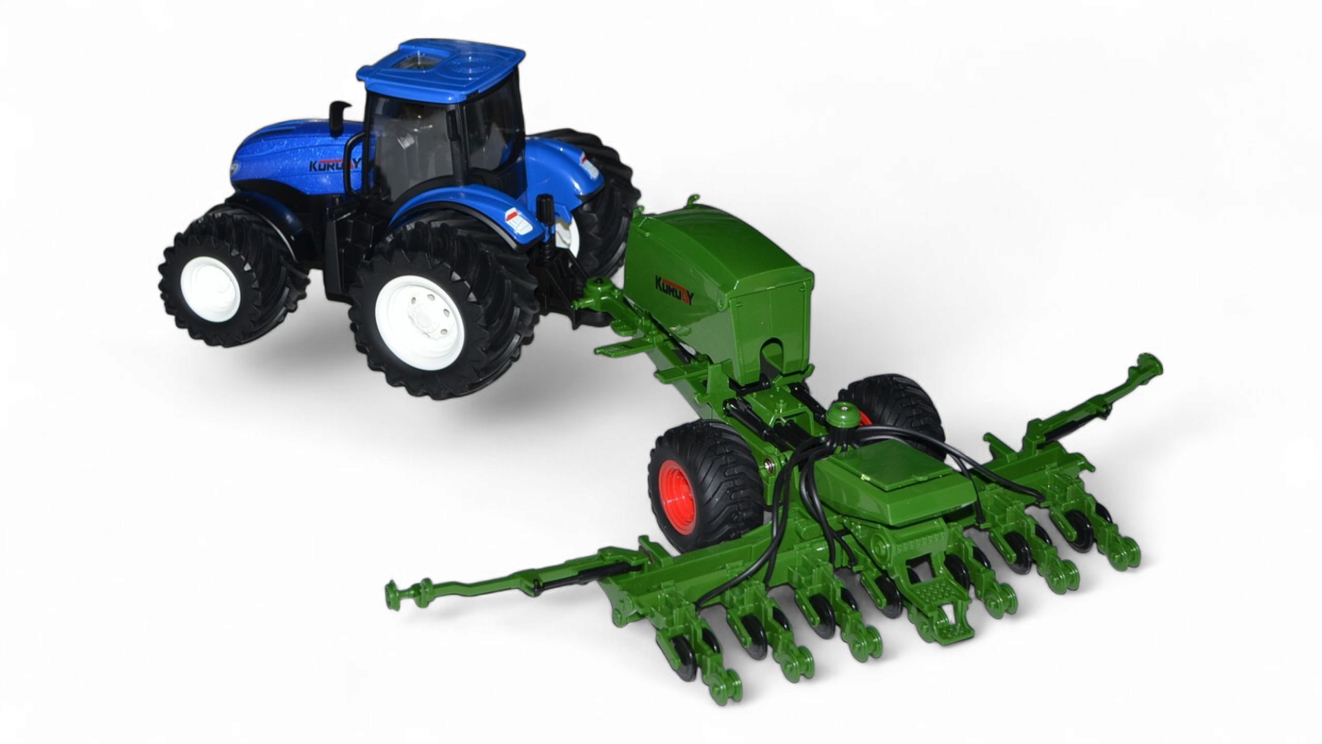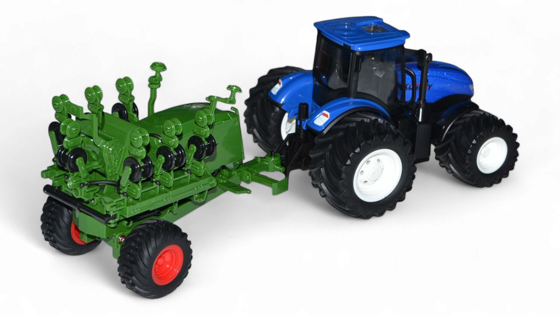 Радиоуправляемый фермерский трактор с зерновой сеялкой,  масштаб 1:24 – это не просто игрушка, а миниатюрная копия сельскохозяйственного трудяги, готовая выполнять определённый спектр задач на вашей ферме в масштабе. Эта модель сочетает в себе реалистичный дизайн, функциональность и передовые технологии радиоуправления, позволяя юным фермерам и любителям техники погрузиться в увлекательный мир сельского хозяйства.
