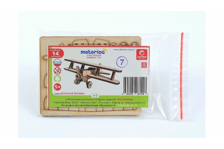 Набор «Советский самолет У-2» один из самых маленьких конструкторов у Леммо, он собирается без клея. У собранной модели вращается винт. Рекомендуется для детей от 5 лет.