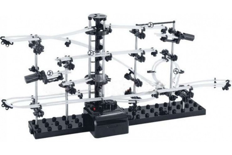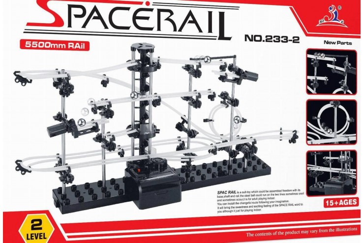 Конструктор SpaceRail представляет собой: основание, алюминиевые стойки, держатели направляющих, стрелки-разветвители, вертикальный подъемник, напоминающий винт Архимеда, и направляющие — белые полиэтиленовые трубки, из которых можно создавать совершенно потрясающие головоломные конструкции, по которым непрерывно будут кататься металлические шарики.