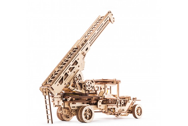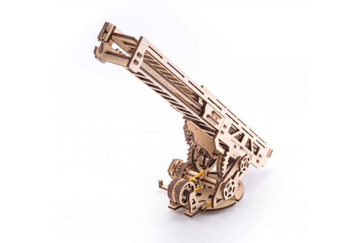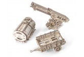 Лестница - имеет несколько элементов управления. Нажав несколько раз рычаг, вы можете поднять лестницу вверх. Рукояткой проворачивайте основание лестницы вправо или влево. Специальный храповик фиксирует выбранное положение. Покрутив вентиль, выдвигайте все три секции лестницы вперед. На конце лестницы есть крючок, чтобы использовать ее в качестве подъемного крана. Как и в большом прототипе, у пожарной машины UGEARS есть дополнительная маленькая лестница. Такая лесенка цепляется на основание большой лестницы, чтобы можно было взобраться наверх.