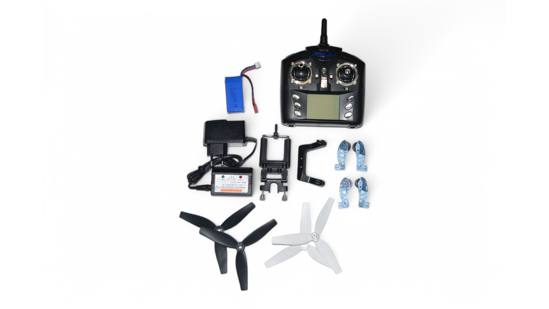 Комплект поставки: 1 квадракоптер, 1 пульт, 1 камера, 1 зарядное устройство, 1 USB кабель для зарядки, 1 антенна, 1 отвертка, 1 х держатель дисплея, 2 болта, 2 винта, 4 колеса, 4 запасных лопасти, 1 х 7.4V 1000mAh батарея, 1 (английский + китайский) руководство пользователя.
