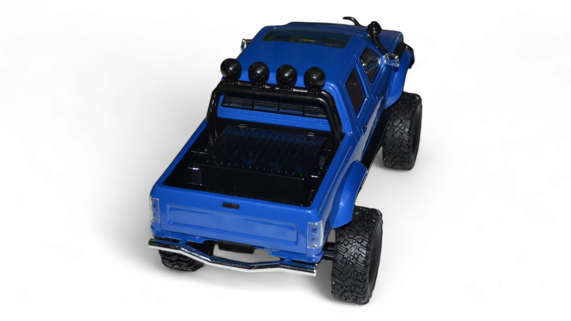 Пикап оснащен полным приводом (4WD), что позволяет ему уверенно преодолевать различные препятствия и бездорожье. Мощный электродвигатель обеспечивает достаточную тягу для подъемов и сложных участков трассы. Прочная конструкция и качественные материалы гарантируют долговечность модели, даже при активном использовании.